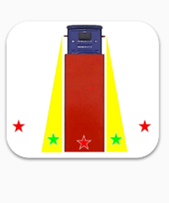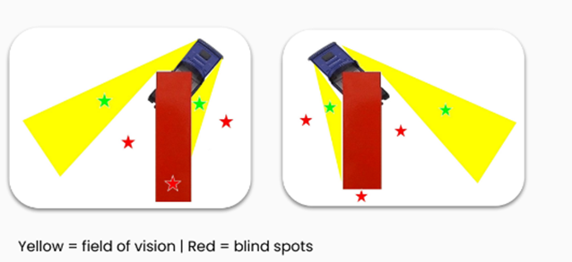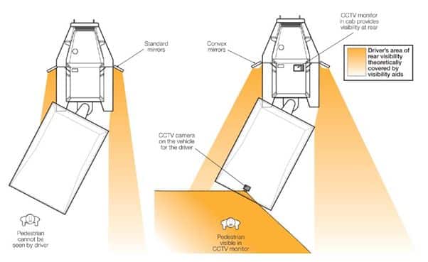 The yellow colour in the picture below is the mirror field of vision for an articulated vehicle. The red stars indicate where the driver can’t see, and the green stars where they can.